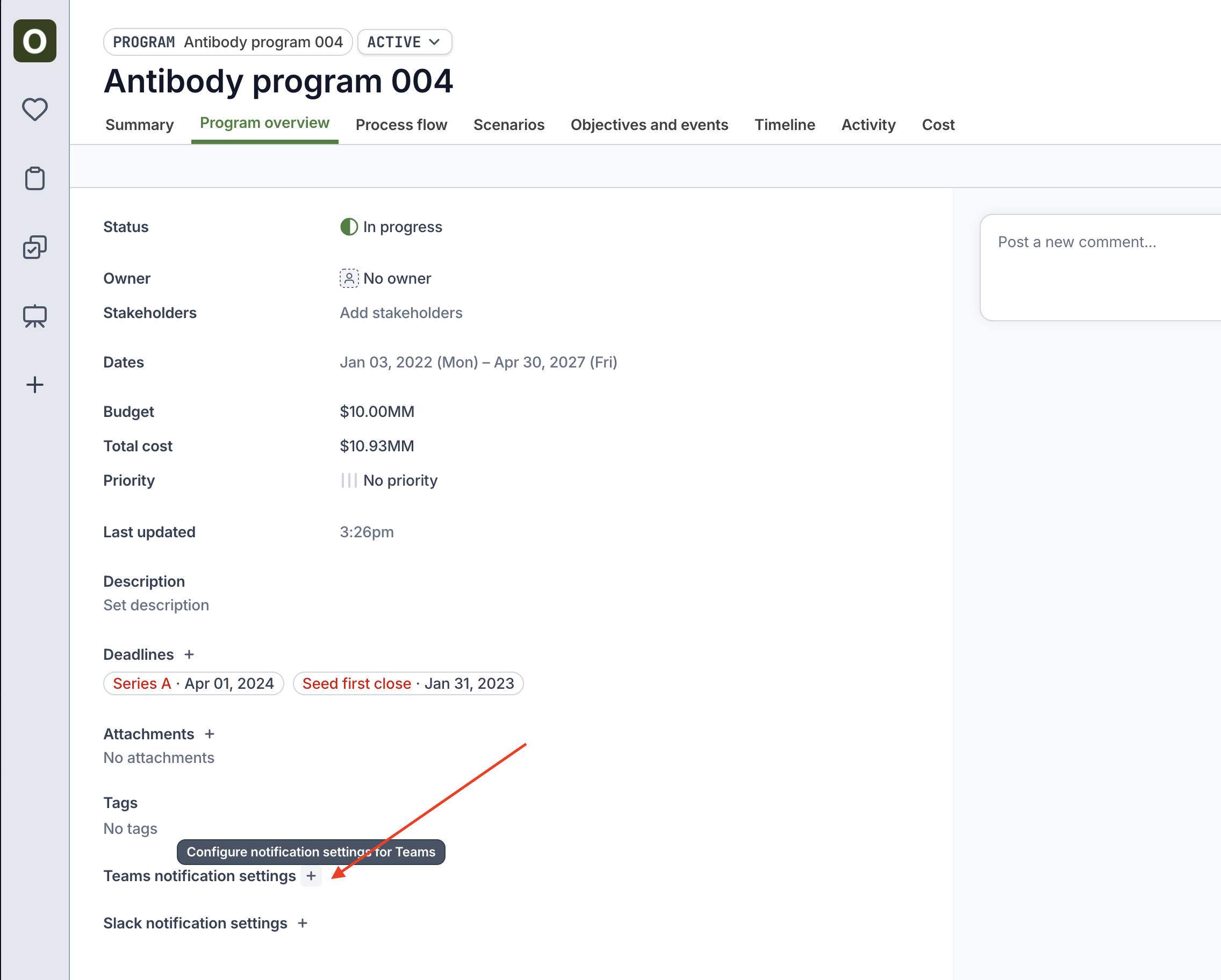 - Go to the program’s Program Overview tab and click the + next to Teams notification settings