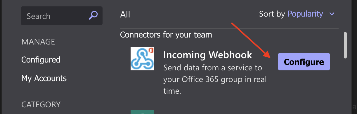 - Click Configure next to Incoming Webhook
