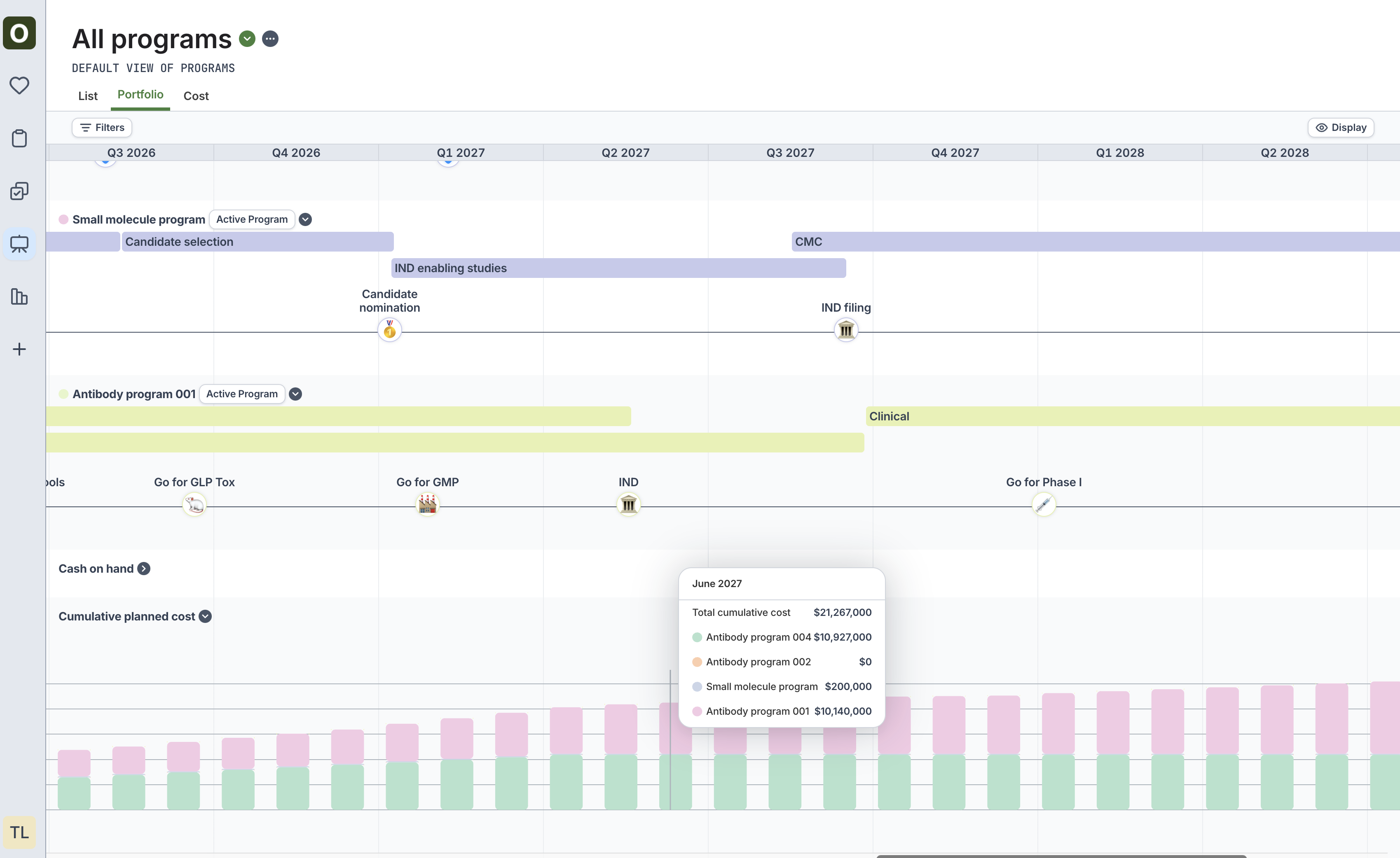 New “Portfolio” tab on Programs allows users to toggle between program scenarios to view all programs’ stage and key event data at once- See cumulative cost and breakdown of that cost at a given time