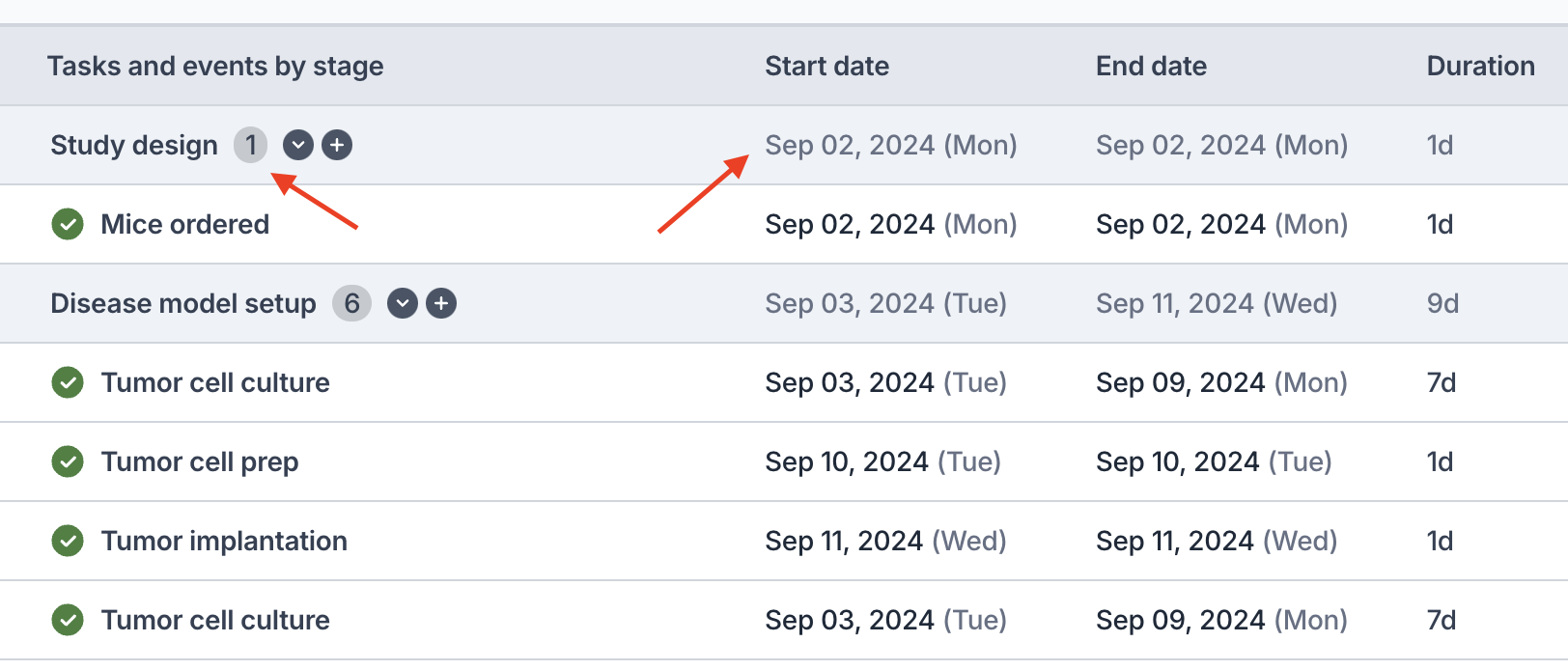 - The earliest start date and the latest end date in the stage