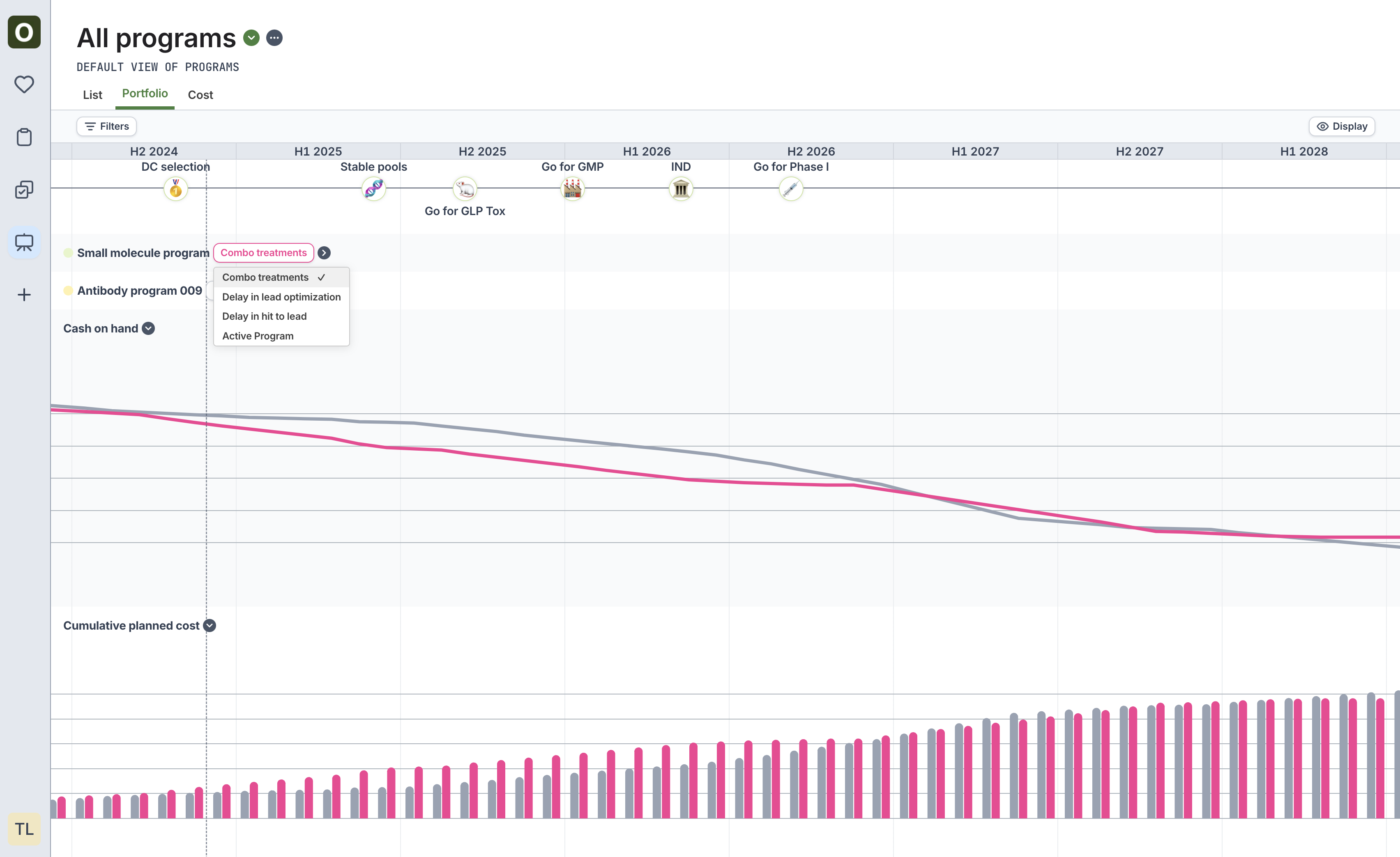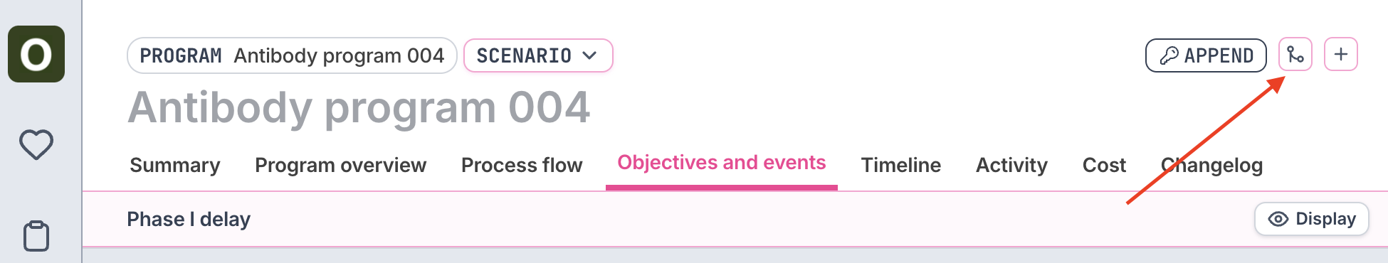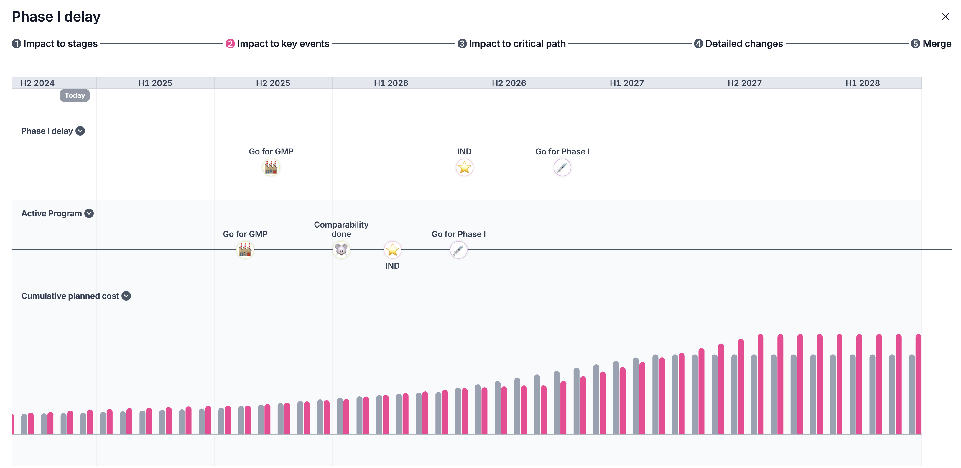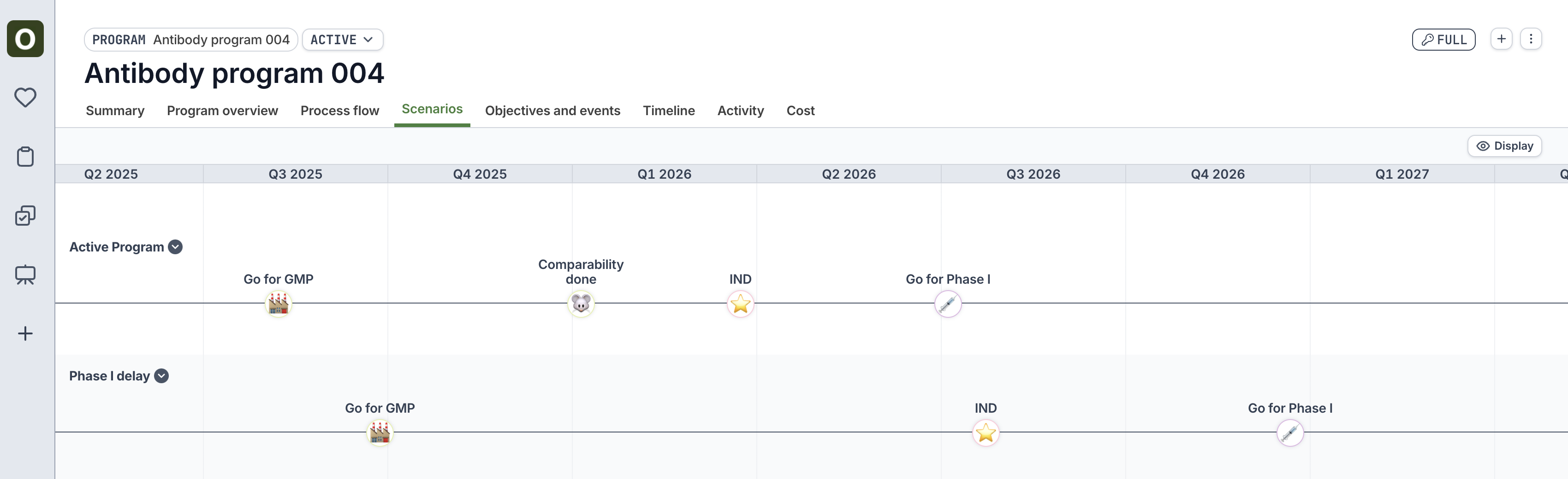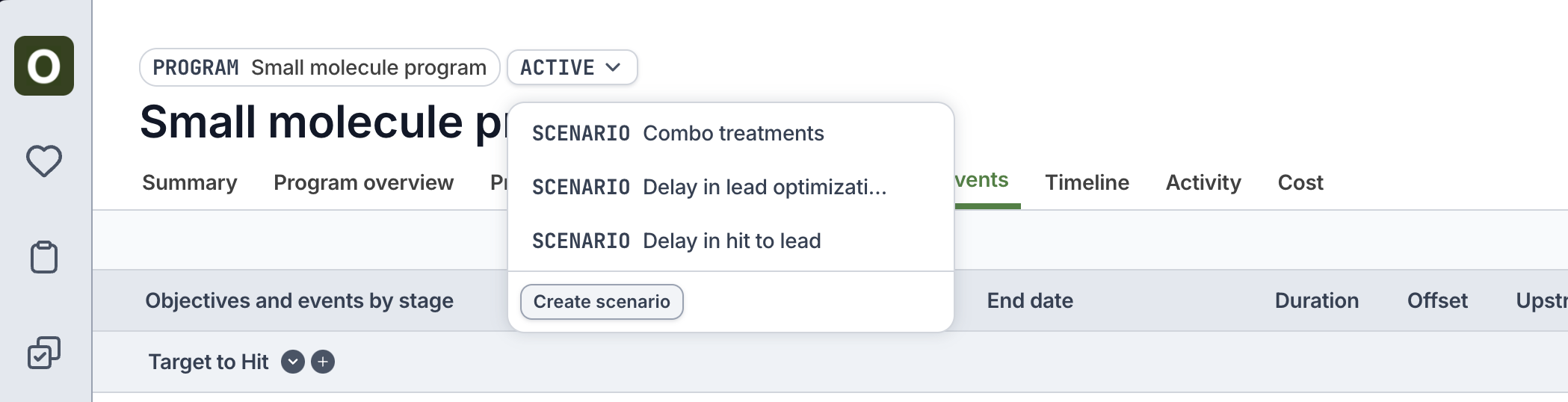Seeing how major milestone dates may shift during scenarios can be critically important. See these side-by-side comparisons by first toggling back to the active program (click the Scenario button above the name > Return to active program) Click the Scenarios tab to view the stage and key event comparison between the active plan and the scenarios.